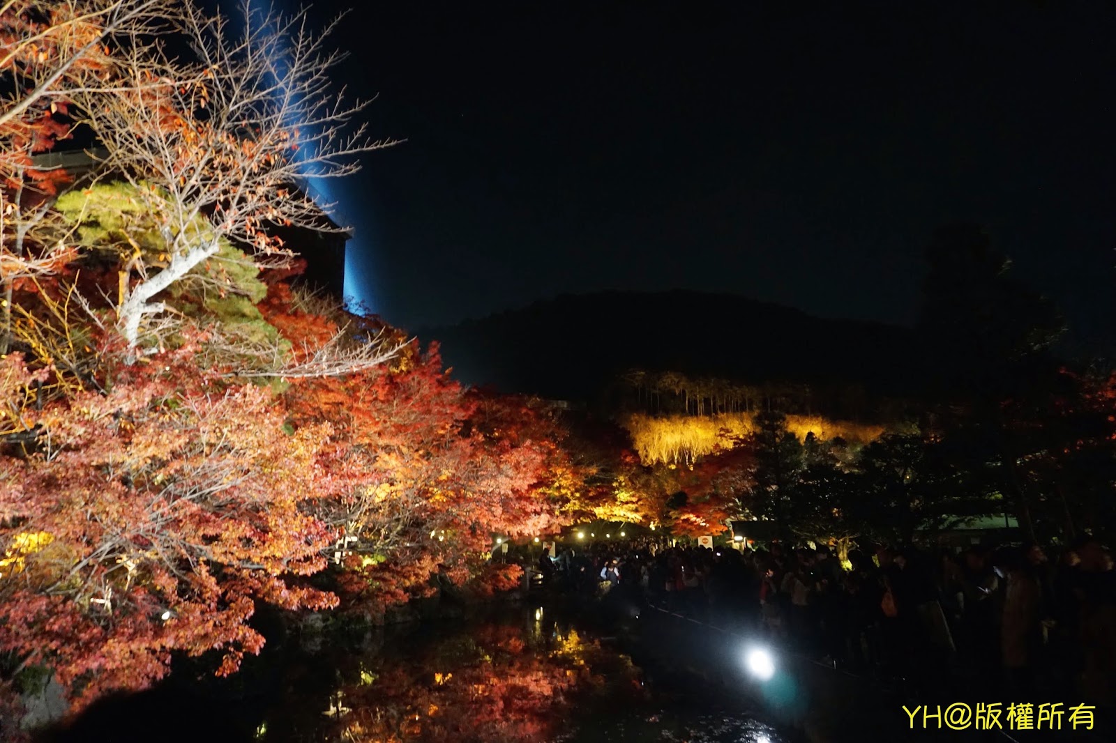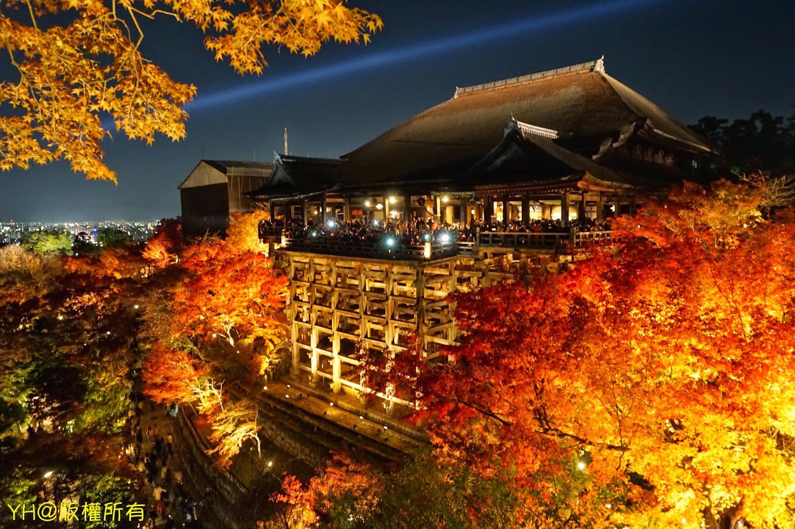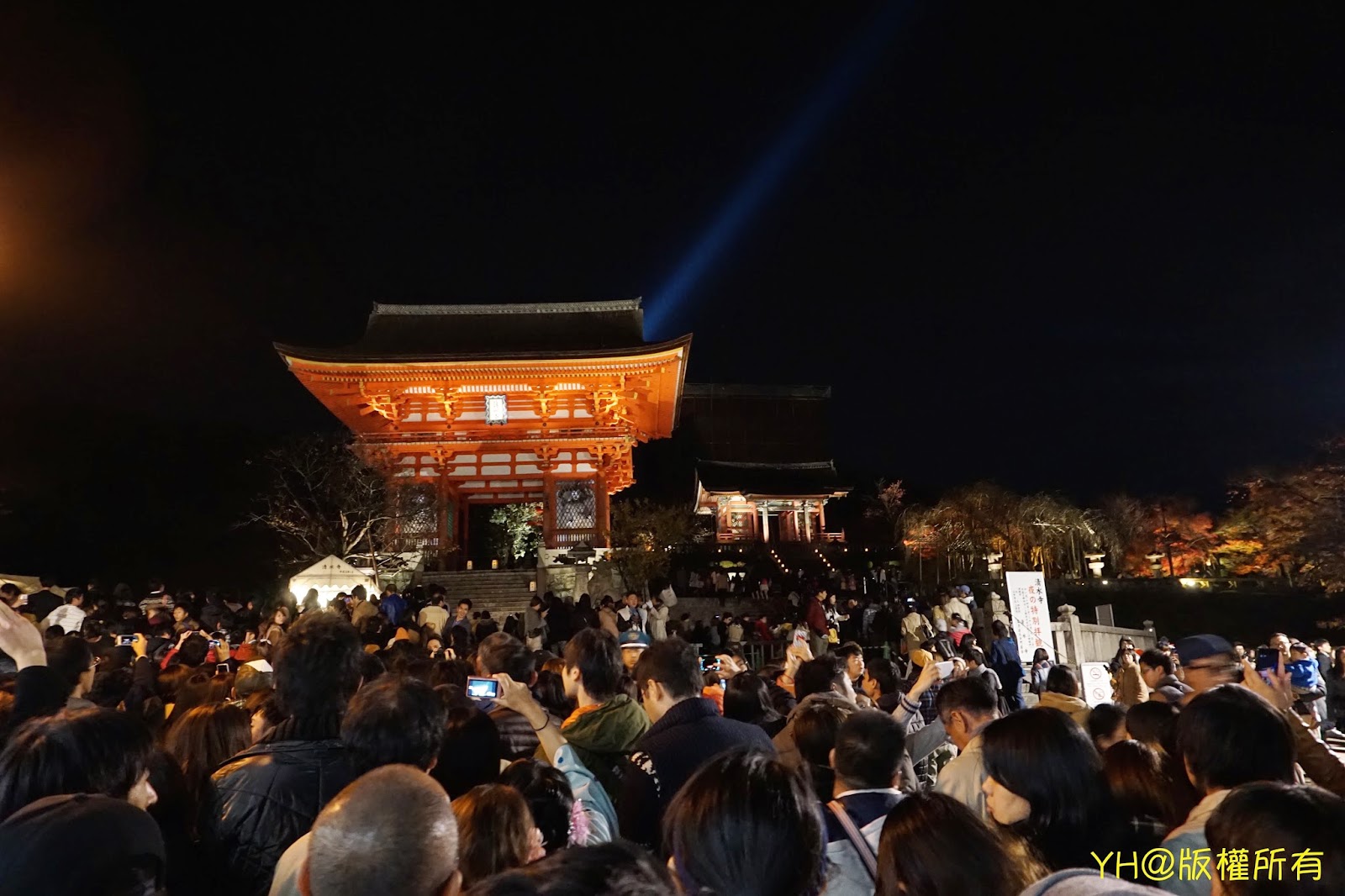 吃飽喝足覺得時間差不多後,便步行前往本日終點站:清水寺夜楓。我們大約6點抵達,人潮已從寺前沿著商店街往下排了,當然我們也是其中一員,周圍幾乎都是日本人,可見日本人也是超愛人擠人的!夜楓開放時間從晚間6點半開始,大家也都很有耐心且守秩序的乖乖排隊依序進入清水寺內。寺內有清楚的行徑路線指示牌,跟著人潮走就對了...基本上大家都慢慢地前進並不會爭先恐後,所以可以放心的欣賞寺內的楓葉景色。