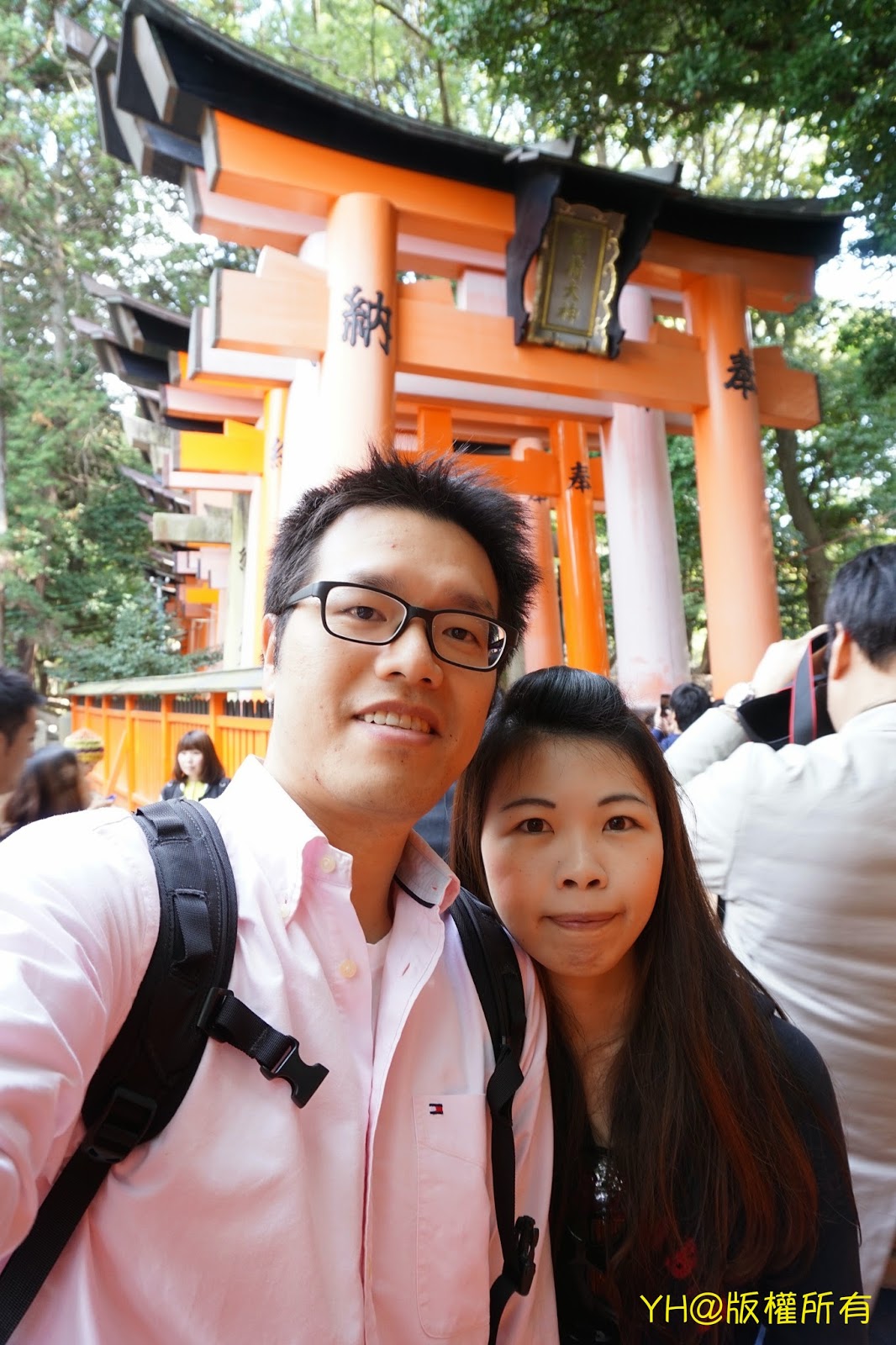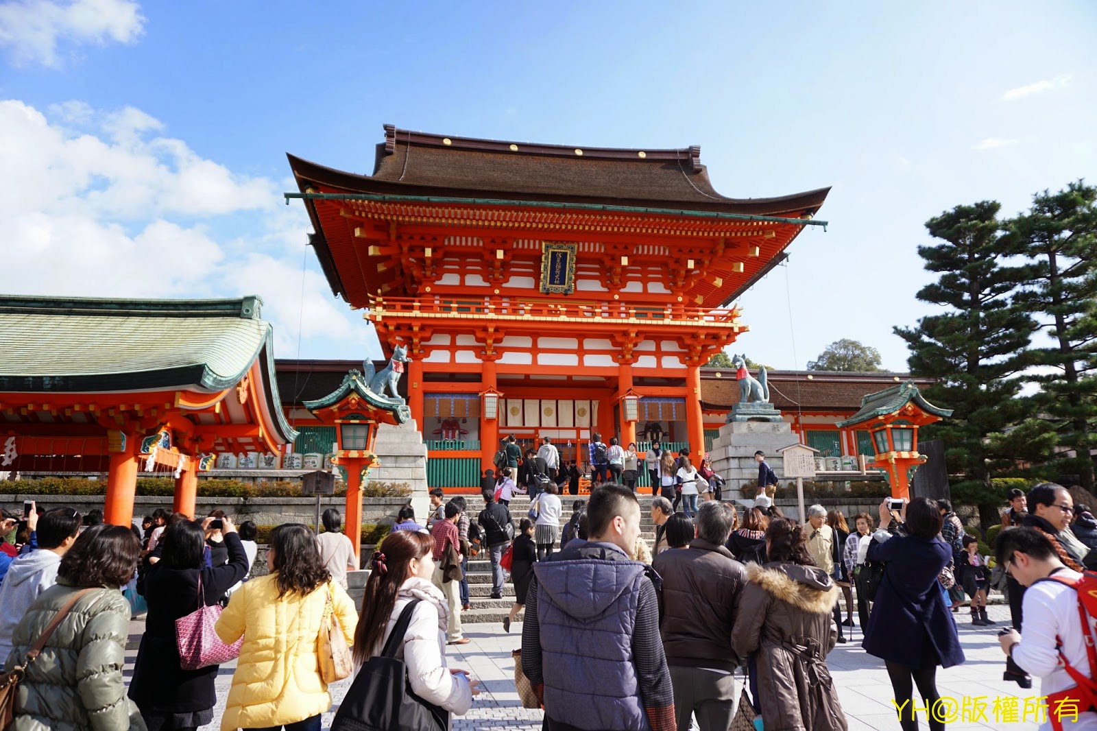 伏見稻荷大社位於稻荷山的山麓,為日本全國各地稻荷神社的總本社。著名的千本鳥居沿著稻荷山綿延不絕,許多遊客一早前往大社,並沿著鳥居遊覽整個稻荷山。大社內的狐狸石像為代表物,擔任伏見稻荷大社的使者。我們大約11點到達大社前,大社前的廣場遍佈遊客,可見其知名程度。